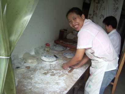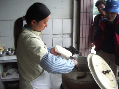 都江堰の近くの麺の店。削麺といって、包丁で削いで作る麺を調理中。旨かった。スープまで完食