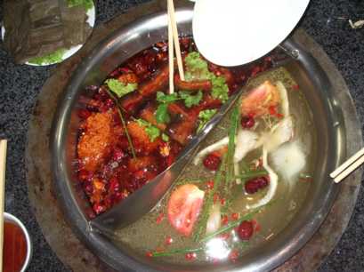 火鍋。赤い方には、唐辛子と山椒が大量に