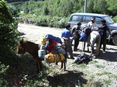 王母村のはずれで、馬に荷物を移す