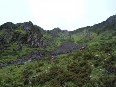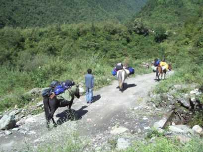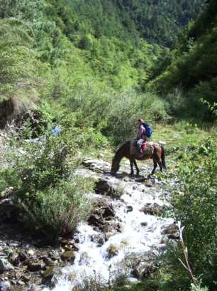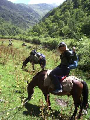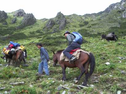 康定(カンディン)から車で山の方へ入り、最後の村、王母村のはずれへ。標高は2,800mほど。そこで荷物を馬に積み替え、ベースを目指す。好天の下、お昼少し前に登り始める。一頭、空いた馬がいたので、大内和子さんが跨る。ベースで昼ご飯だ、などど気楽に考えながら、ヒイラギブナの灌木の道を登っていったが、なかなかたどり着かない。それもそのはずで、後で測ってみると、ベース地は1,300m上の、標高4,100mにも達した。メンバーは空腹で足が上がらず、いわゆる「シャリバテ」状態。「飯はまだか〜」「ベースはどこだ〜」と不満の声にも力がない。上の方は灌木も尽き、岩と草の急登に変わる。空腹と高度が重なって、つらい登りだった。馬たちも、傾斜がきつい上に、岩で蹄が滑るため、足取りが覚束ないようだった。そんな中、少しだけ馬に乗ってみたが、馬には気の毒ながら、これは大変楽だった。しかし99%は歩きで、数歩歩いては立ち止まって息を整えていると、岩山の肩の辺りのコル状に達する。