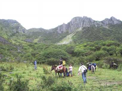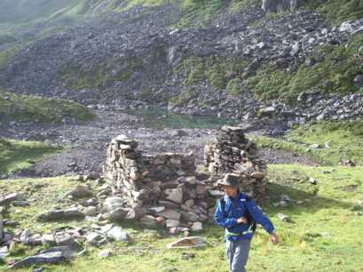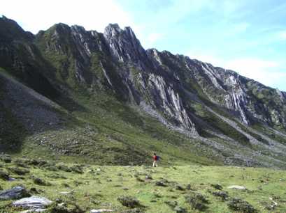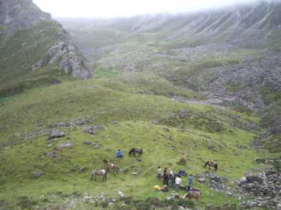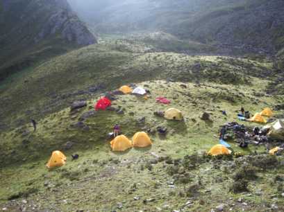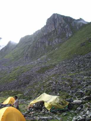 そこはちょっとした峠になっていて、目を上げると、蓮花夕照連山の尖った岩峰が天を指している。二十メートルほどの眼下には、なだらかな高原が広がり、馬や馬方の人たちは既に荷物を下ろしてくつろいでいた。素晴らしいベース地だ。雪豹体育探検公司の準備してくれたテントは、二人用の新品だった。しかも、なんと一人一張りという贅沢さ。早速、平らな所を探して、順次張り始めた。最後にじゃんけんで、一番平らで寝心地のいいテントを決めた。炊事テントは、高原に点在するカルカの石組みの一つをタープで被って作った。
