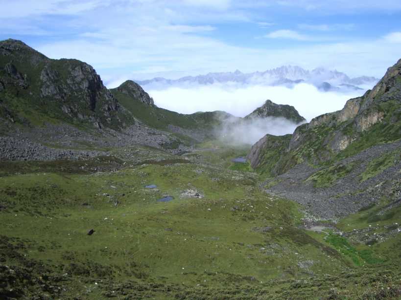 上の方から振り返る。ガスがかかっている辺りがベースキャンプ。遠く、ミニヤ・コンカ山群の一部が