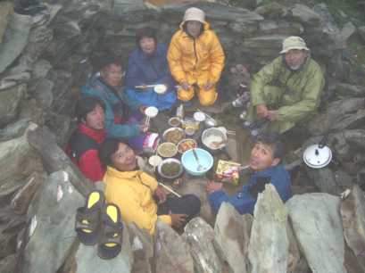 そのうちに大内、溝渕両氏も戻り、ベースは更に活気づいた。夕食はカルカの石組みの中で。山行中、食事はずっと鐘(ショウ)さんが作ってくださっていたが、彼は四姑娘峰などに日本人を案内した経験が豊富なため、私たちの口にとてもよく合った料理を出してくれた。明日は下山だ。