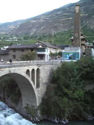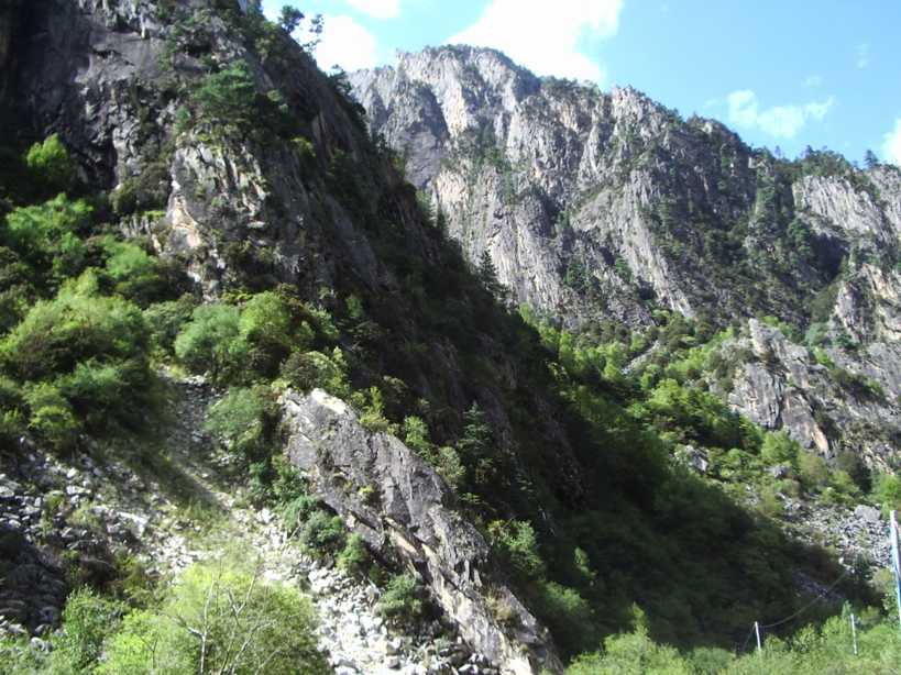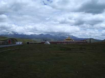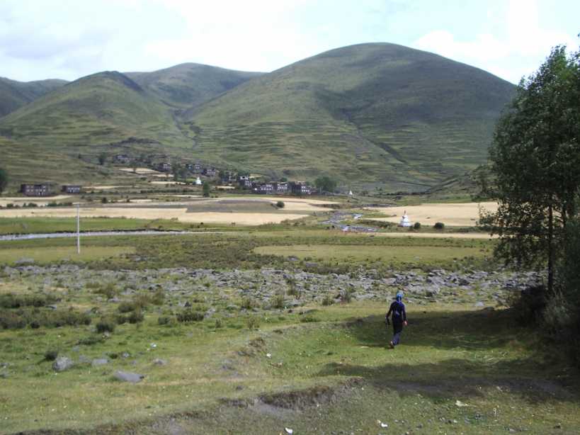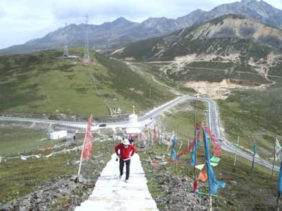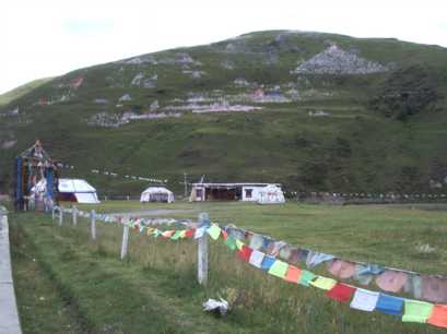 ルートを引く予定の岩峰のある、双橋溝へ移動する。早朝、ホテルの近くの店で豚骨スープの麺を食べ、折多山(4,962m)の見える4,100mの峠を越える。チベット仏教のチョルテンがなびき、峠を越える無事を祈るお経の書いてあるビラが散らばっている。それを集めて、展望台からばらまいたりした。行く手は標高3,400mほどの広い高原状になっており、村々のチベット建築や、山や清流や放牧場が、美しい調和を保っていた。路上でチーズを売っていたが、お世辞にも私たちの口に合うとは言い難いものだった。更に、切り立った断崖のある谷沿いを通過。流れの脇には露天風呂が。柏瀬さんはいたく興味を惹かれたようで、「ここで一日、ルート開拓してもいいね」と本気で言われた。確かに、そのうち再訪したいと思わせる谷だった。