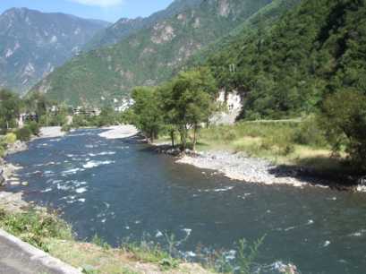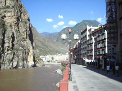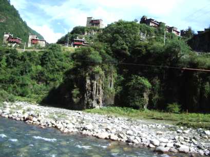 両岸にはチベット家屋が点在する