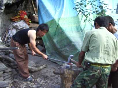裏庭では、ふいごで火をおこして鍛冶をしていた