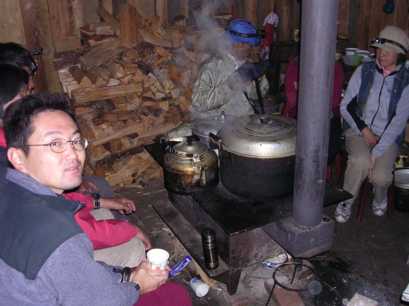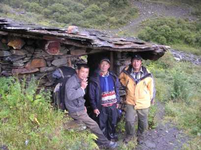 下山の途中、放牧小屋で。左から、楊さん、鐘さん、姜さん
