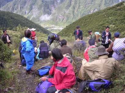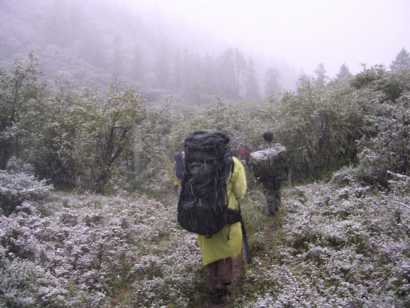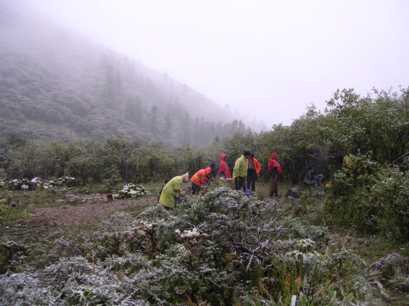再びポーターをお願いして、車で双橋溝の一番奥の紅杉林まで移動し、そこから4,768mの峠を越えて、ピンプン溝に向かう。一昨年のベース地を過ぎると、思い出が蘇って懐かしかった。しかし、3,800mを過ぎた辺りから、雪が。しんしんと降り積もり、行く手はガスに。村人たちを代表して王さんが、「岩に雪が載って滑るし、ガスで道もわからなくなる」というので、戻ることに。紅杉林で水晶を買い、再び双橋渡暇村へ引き返してもう一泊した。晴れれば雪も溶け、何とか峠は越せそうなのだが、夜になっても天気は回復しなかった。