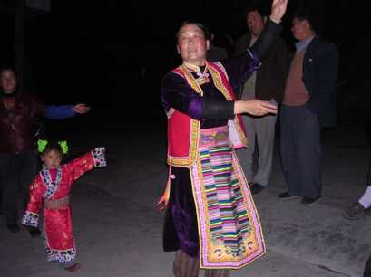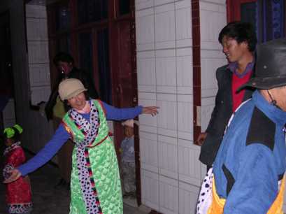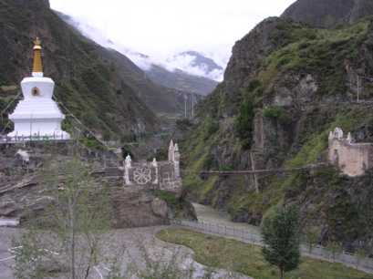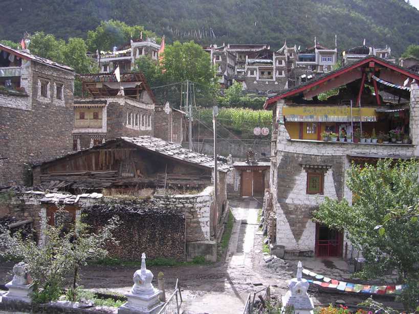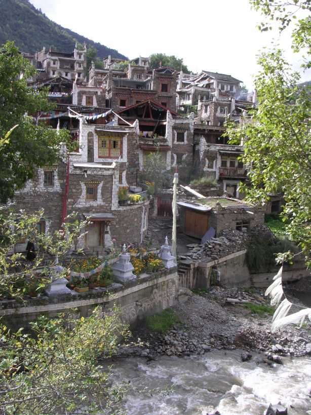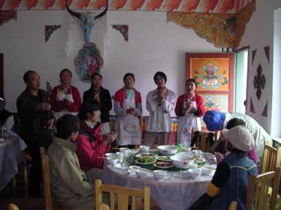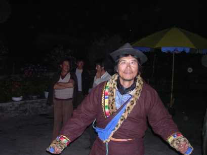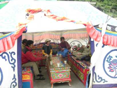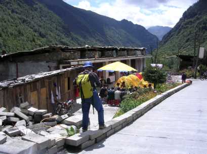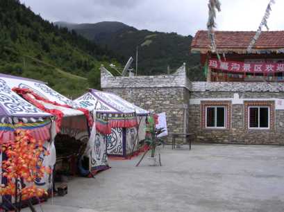 結局天候が回復しなかったので、姜さんが村の車をチャーターして、大回りでピンプン溝に行くことに。急な予定変更に対応できるフットワークの良さは、雪豹体育探検公司ならではのものだ。日隆〜ブンセン〜理県を通って行くのが距離的には近いのだが、すぐ近くの日隆までがすごい渋滞だということで、逆回りで、小金〜マルカン経由で行くことになった。「五時間くらいで着くよ」などど姜さんは言っていたが、結局十時間、車に揺られた。途中、パンクを修理して時間を費やす。昼食は瑪嘉溝で。ここも渓谷の観光地で、姜さんはここの開発に一役買っているらしい。屋外の装飾を凝らしたテントでお茶を飲みながら待ち、建物の中で、地元の有力者で議員をやっているという方も交えて、料理をいただいた。従業員をしている子どもたちが、歌を何曲か歌ってくれたりした。