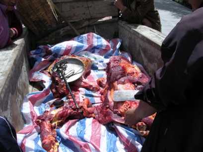 トラクターの荷台にヤクの肉を積んで売りに来ていた