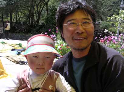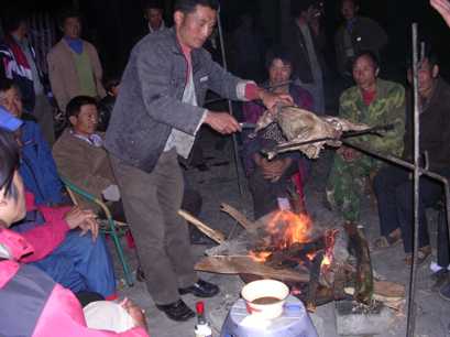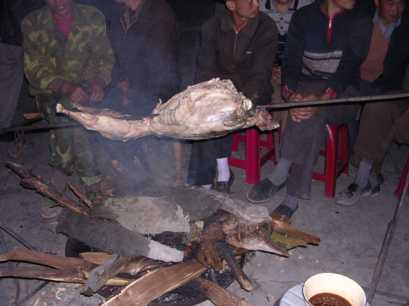 ベースを撤収。雪の積もった上を歩くのはどうかと思われたが、ほんの数十メートル下には全く雪がなかった。ポーターをしてくれた人たちと前後しながら、12時に双橋渡暇村へ。下は晴れ渡って別世界のようだった。宿では子羊の丸焼きの準備が進んでいた。濡れた装備を庭中に広げて乾かした。深田さんは下に居た間、村の人と観光に出かけたりしていて、「世界うるるん滞在記」の気分だったようだ。楊さんの息子のヤン・サンワくんと、今年も遊ぶ。でも一度相手をし始めると、なかなか解放してくれない。