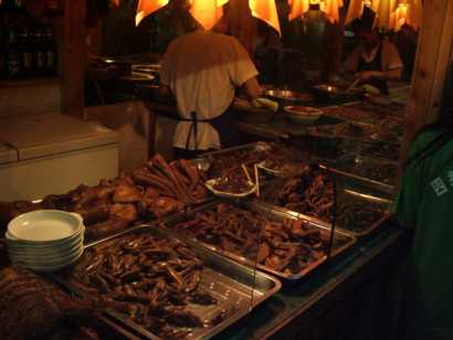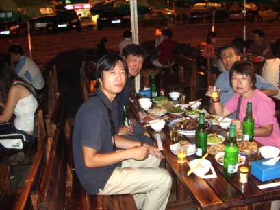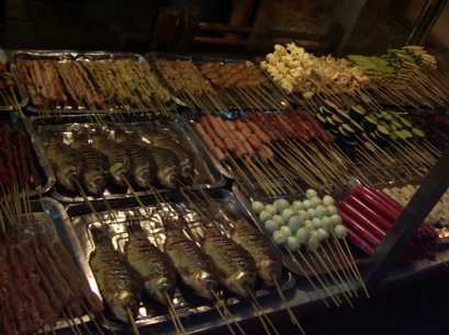 「では皆さん、パスポートを」という姜さんの声に、須貝くんが青くなった。「ない! パスポートがない!」 空港で荷物をカートから車に移す時に、カートに置き忘れたんではないかと言う。「なかったら、重慶までいって、再発行を何日も待たないといけないよ。そこでのホテル代は自分持ちだからな」大内さんの言葉に焦りつつも、やはり見当たらない。すっかり消沈した頃、「車のシートにありました」と姜さん。落ち着いた所で、近くの屋台に夕食に出る。銘々が気に入った食材を注文し、その場で料理してもらう。アヒルの舌、豚の耳、豆腐の串焼きなどで山盛りになった皿に埋もれて、スノー・ビールで乾杯。