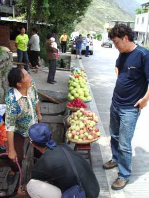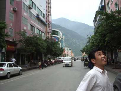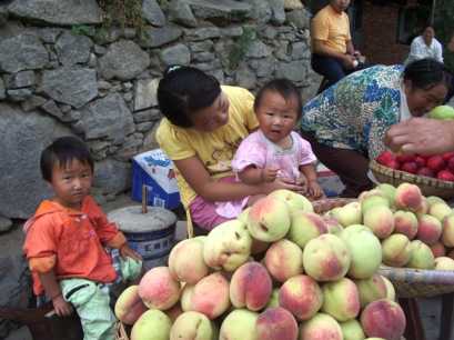 道ばたで売っていたリンゴや桃やスモモを買ったりしながら、夕方前に康定に着き、カラカラ飯店に投宿。そこで、地元の登山家で顔中髭だらけの熊安平(ション・アン・ピン)さんを紹介していただく。長年、コンカ山登山のサポートをしており、康定ではかなり有名人だということだった。熊さんを交えて、蓮花夕照連山偵察のためのミーティング。予定していた七色海・木格措(大海子)は観光地となっており、付近に岩峰がないので、行かないこととなった。ちなみに、今回の蓮花夕照連山を初めとするミニヤ・コンカ周辺の岩峰群の偵察は、クライミングのメインに考えている双橋溝が七月に野生のパンダの生息地として世界遺産に指定されたので、そのうち登攀禁止になるかもしれないという配慮から、そうなった時のための目標にするために行っている。