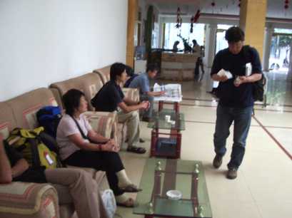 午後、福岡空港を発つ。エントリー・カードを書きつつ、ビールとワインで機内食の蕎麦を食べていると、早くも上海上空に。上海空港では入国審査や乗り継ぎをあわただしく済ませ、同じ機体の同じ座席に戻って成都へ向かう。成田や関空からのメンバーは、一度預け荷物を受け取って、空港内で数時間〜10時間ほど時間を過ごしたとのことで、福岡からが一番スムーズに成都に着けるようだ。関空からの山崎君は後に、「新幹線で博多まで行って、福岡空港から乗った方が時間的に早い」と感想を漏らしていた。