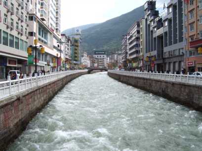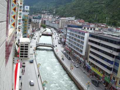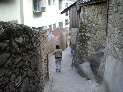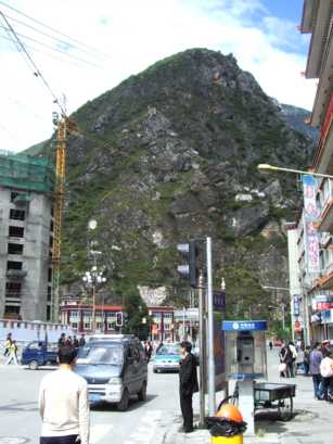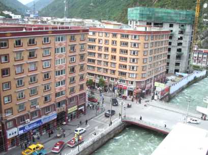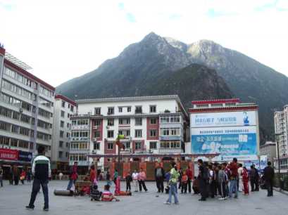 その後、街を散策に。康定はチベット族自治州であるガンズ州の州都で、四方を高い峰々に囲まれてはいるものの、かなり大きな街だ。峰の一つには、チョルテン(チベット仏教の経文が書かれた旗が連なったもの)がたなびき、チベット仏教の大きな壁画が描かれていた。標高は2,500mほど。街を貫いて整備された河に急流が流れ、中央には、一段高くなった、サッカーが楽に出来るくらいの広場がある。昼間、少女たちが雑伎をしていた。夜になると大勢の人々がやってきて、音楽に合わせてみんなで踊り始めた。夕食は近くの店で、辛くないように特別に味付けしてもらった四川料理を。