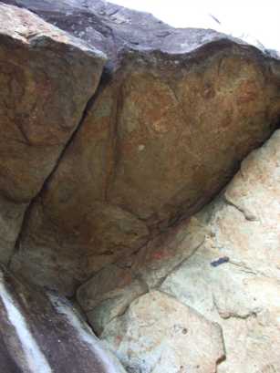 矢筈岳上部岸壁右側。マスターズ・ルーフは中央の三角形のハング。ハング上の黒い岩に上向きの黄色い三角形の模様がある。その頂点辺りで終了。