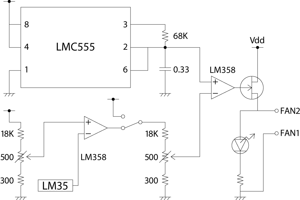 何度も書くが、私は電気工作に関しては素人である。例によって情報を求めネットをうろついてみると、ファンコン自作の情報はかなりあるねぇ。一番安くて簡単なのは、やはり三端子レギュレータを使う方法らしい。でもこの方法だと「OS制御で変動する電圧をさらにコントロール」は無理みたいだ。で、注目したのがPWM制御。これなら変動する電圧をさらにコントロールできる。こちらの記事を参考に書いた回路図が左。ちなみにこの記事の3ページ目の「回路図その2」は抵抗の数値が間違っている部分があるので要注意。