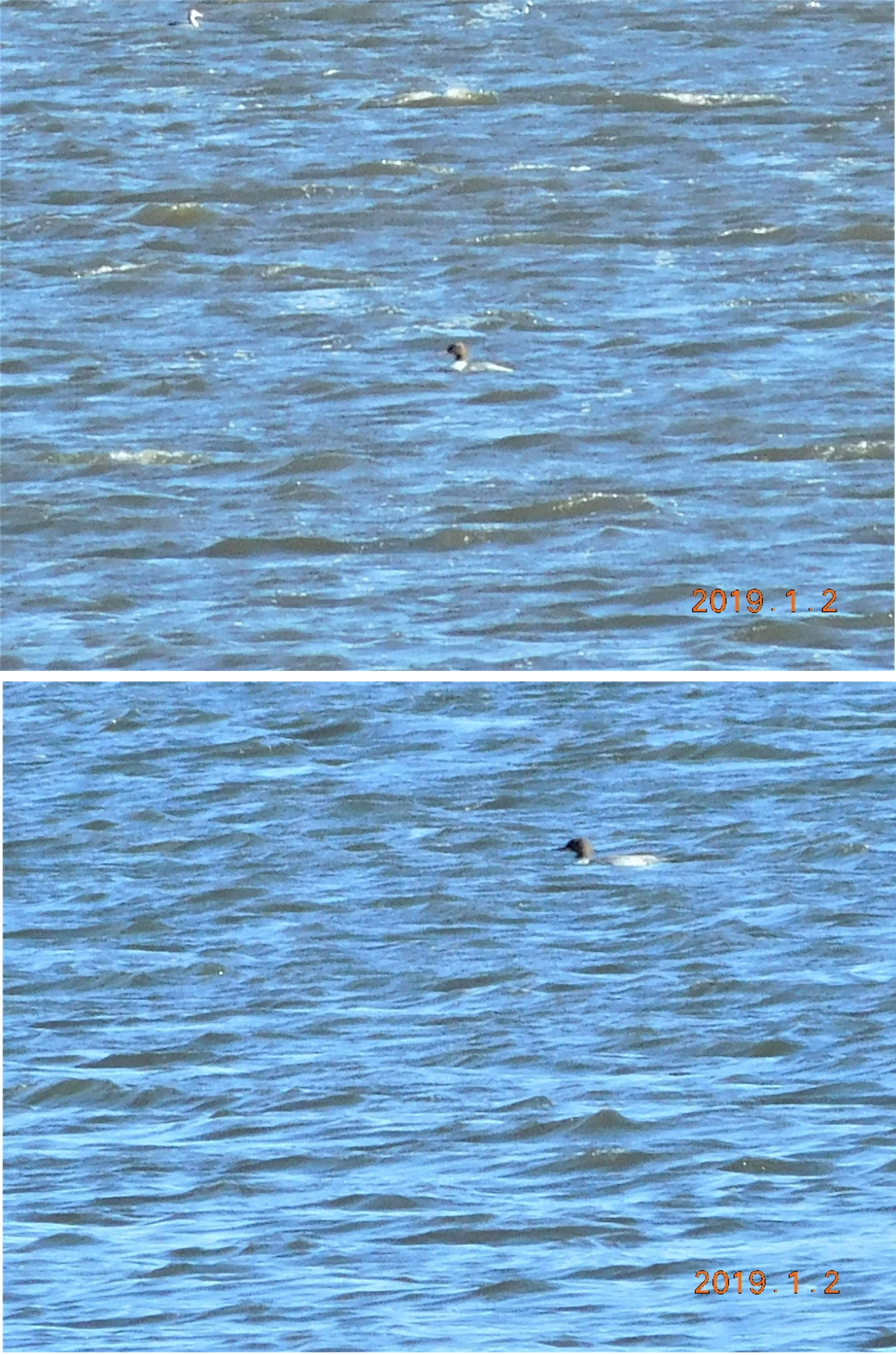 | カワアイサ | ♀1 | 目視 | 1月2日 | 11時 | 晴 | 多々良沼弁財天周り | 加藤 治男 | 今年も2日カワアイサ♀1羽飛来しました。(昨年は同日カワアイサ♂1羽飛来)、強風の為波間で確認できました。(遠く不鮮明ですが)、一日で抜けたようです。3日は久しぶりに、ハマシギ6羽再飛来していました。 | 会員 | ||